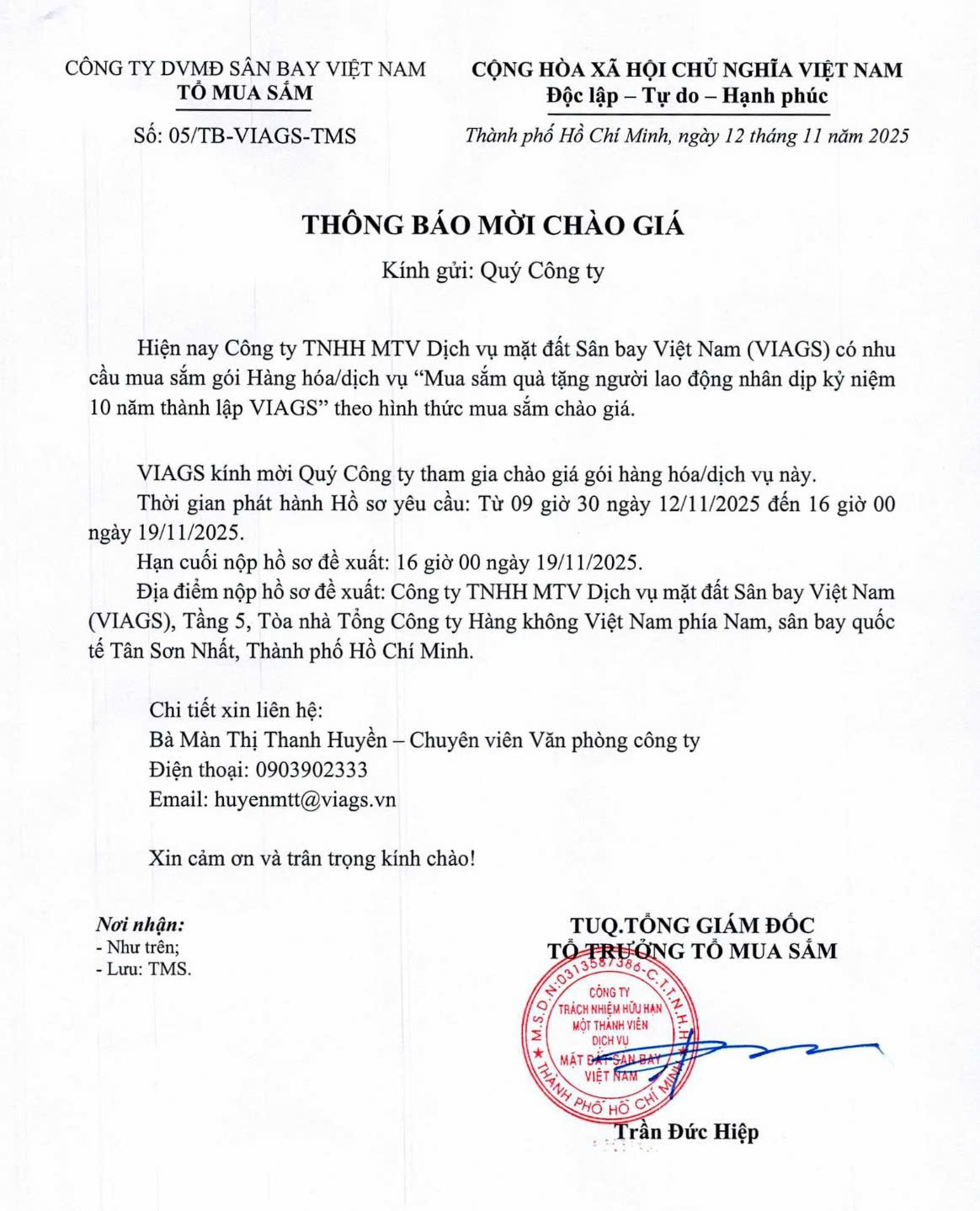 Thông báo mời chào giá gói HHDV: Mua sắm quà tặng người lao động nhân dịp kỷ niệm 10 năm thành lập VIAGS