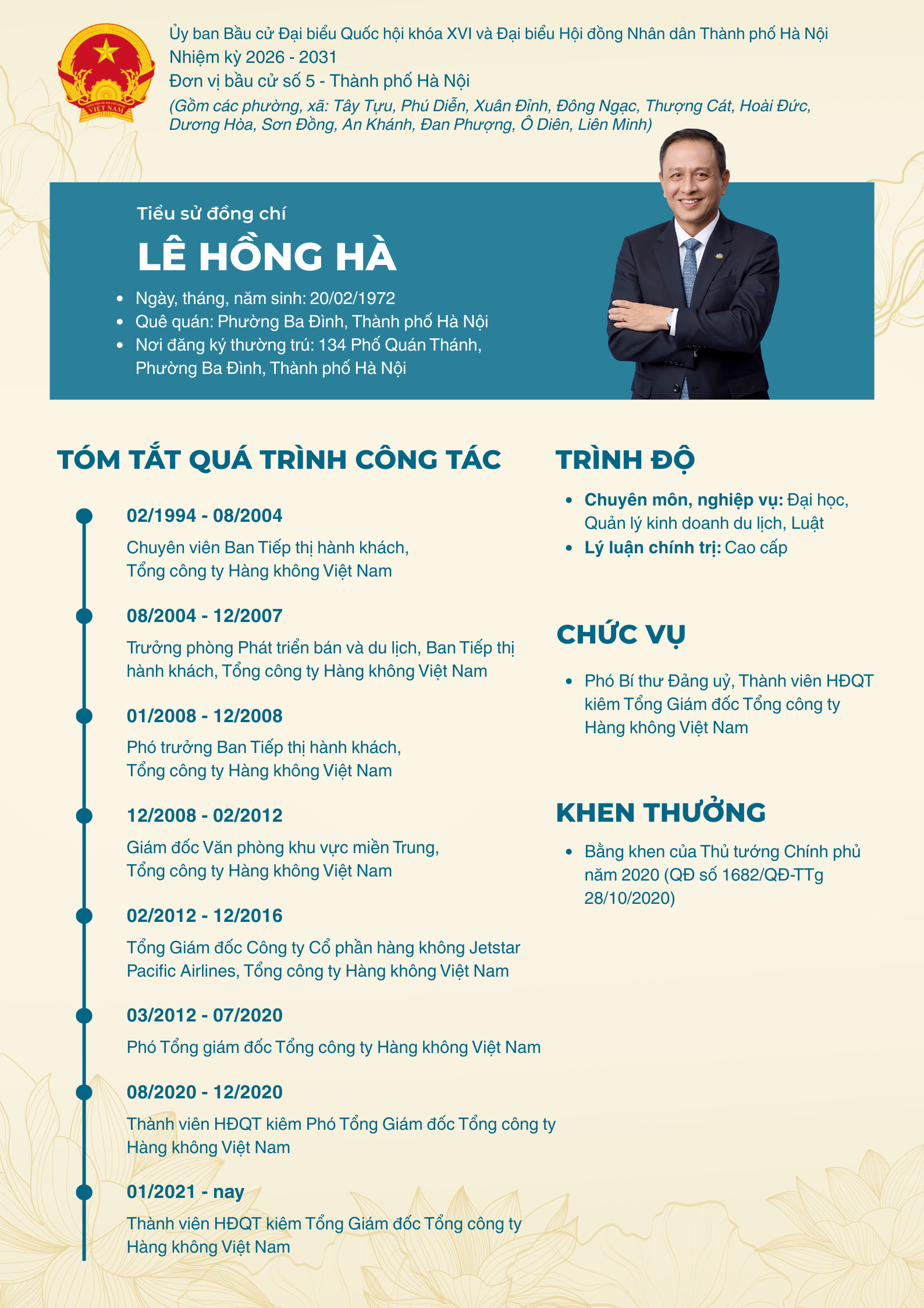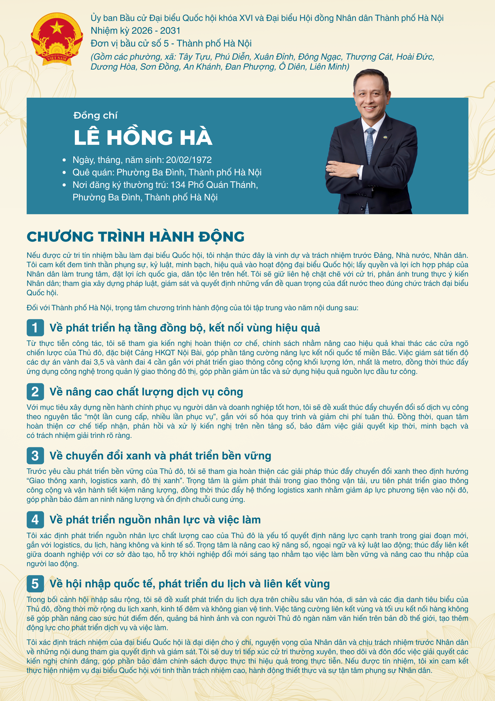 Tổng Giám đốc Lê Hồng Hà ứng cử Đại biểu Quốc hội khoá XVI, nhiệm kỳ 2026-2031 tại đơn vị bầu cử số 5, Thành phố Hà Nội gồm các phường, xã: Tây Tựu, Phú Diễn, Xuân Đỉnh, Đông Ngạc, Thượng Cát, Hoài Đức, Dương Hòa, Sơn Đồng, An Khánh, Đan Phượng, Ô Diên, Liên Minh.